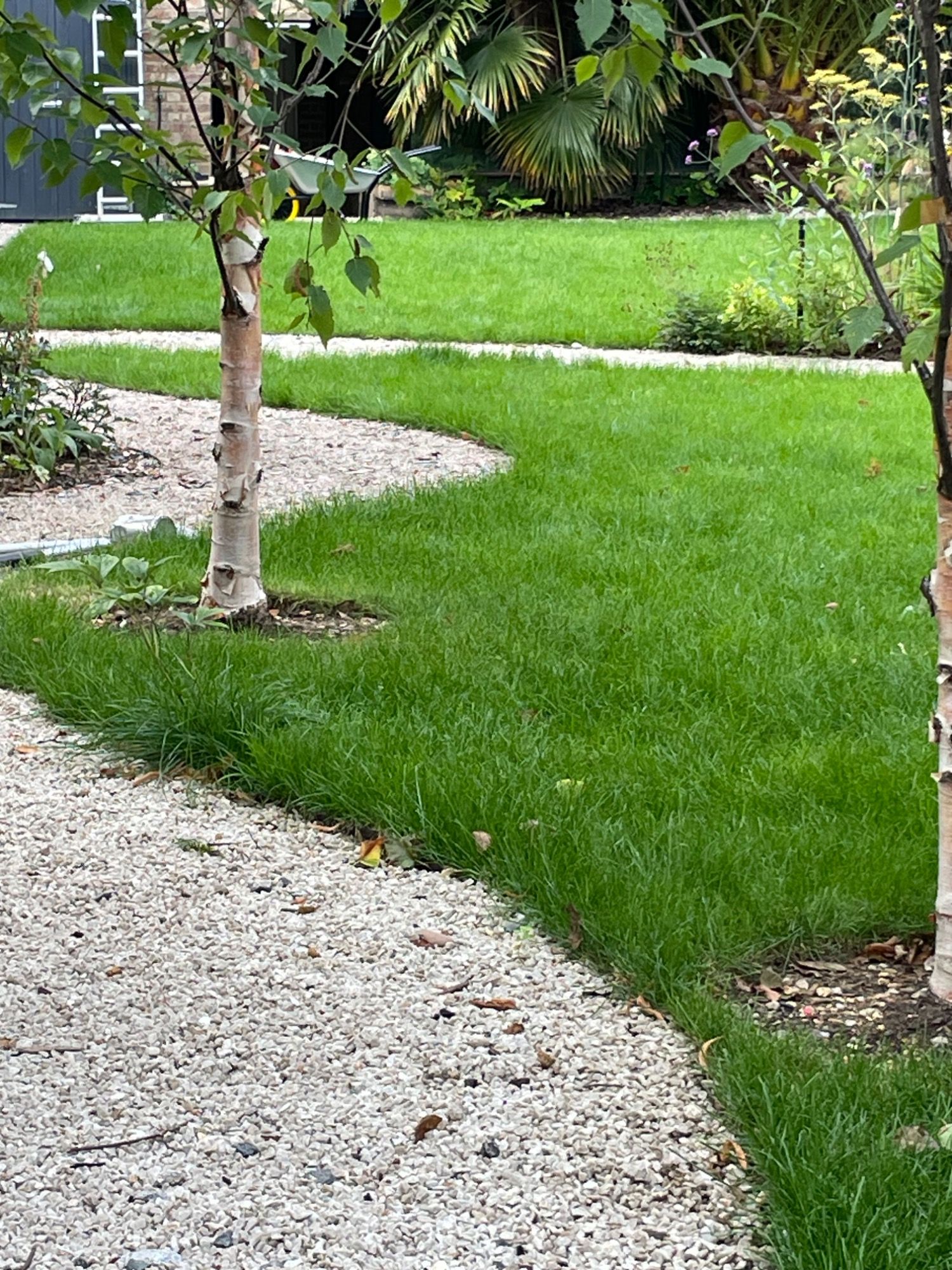 Winding gravel paths through deep plant borders, past trickling water and a birch tree copse, lead to a studio and play area behind a large lawn